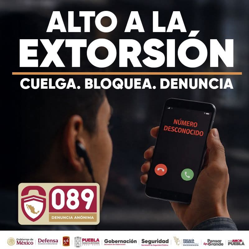 No estas solo en caso de un intento de extorsión. El Gobierno de Puebla te brinda apoyo y solo debes llamar al 089.